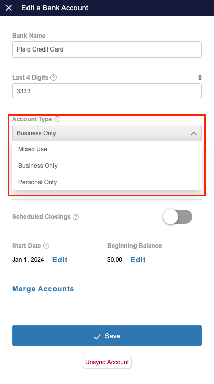 - Mixed Use - You’re prompted to tag each transaction as Business or Personal.