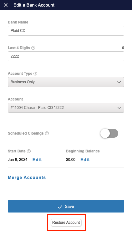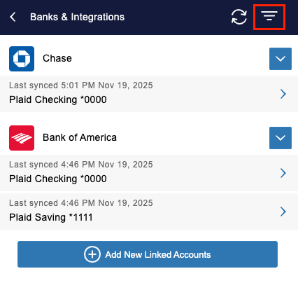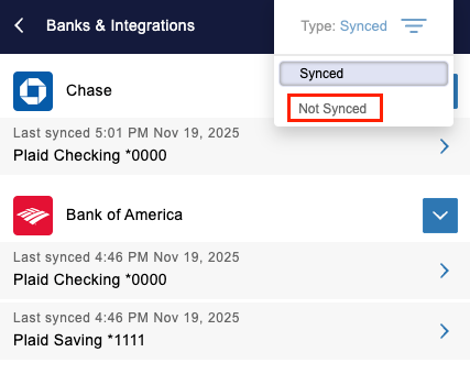 Once an account is disconnected, it can be re-synced at any point. To find these easily on the Banks & Integrations screen:
