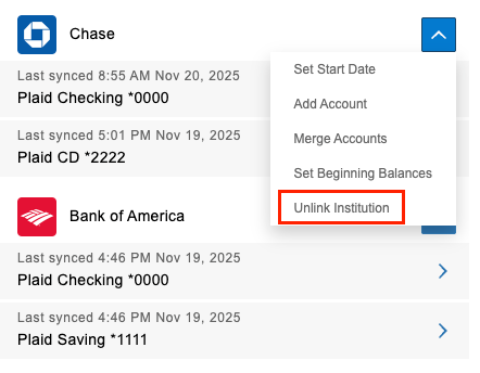 - Select ‘Unlink Institution’