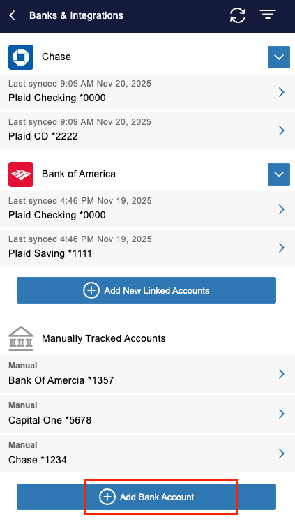 - Under ‘Manually Tracked Accounts’, click ‘+ Add Bank Account ’