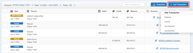 If you need to manually enter transactions or add manual journal entries, you can do so by clicking the ‘+Add Transaction’ button and selecting which type of transaction you need to add.