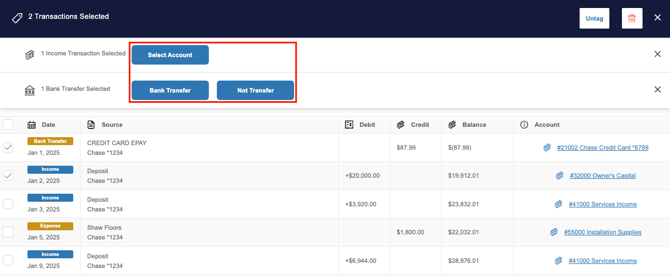 You can also bulk edit transactions in the GL. Simply check the box next to each transaction you want to group, or use the box at the top to select all. Once selected, you’ll be able to perform a limited set of bulk actions, such as changing the account or category, untagging, or deleting.