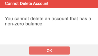 You will see an error if you try to delete a GL account that has a balance or is associated with a linked bank account. To proceed, zero out the account or unlink the associated bank account.