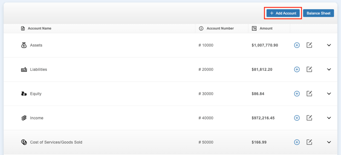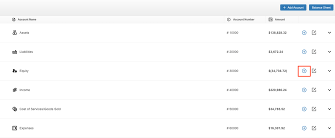 - You can also add a new GL account in-line by selecting the ‘+’ icon within the desired Parent Account’s row