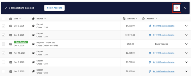 - Select the checkbox next to each transaction that you wish to delete or use the select-all option at the top