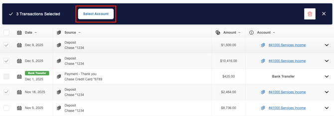 - At the top, click ‘Select Account’ and select the category/account the selected transactions should be tagged to