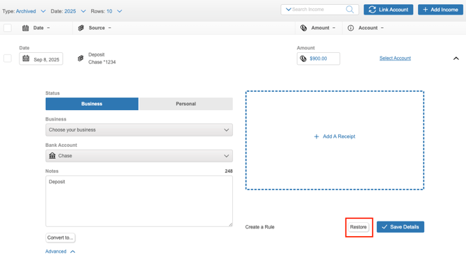 Once restored, the transaction will be moved back to the active view of the Money In Dashboard and will be reflected on your reports/totals.