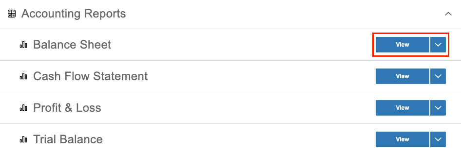 How do I view the Balance Sheet? Navigate to the section Accounting > Financial Statements > Accounting Reports Locate the Balance Sheet Click the 'View' button