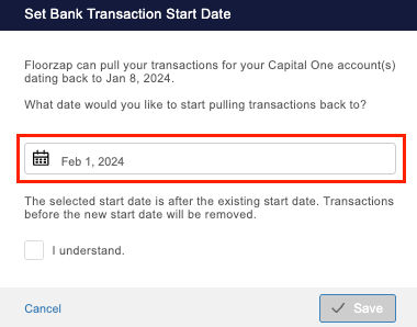 By default, Floorzap imports transaction history through the start of the previous year.
