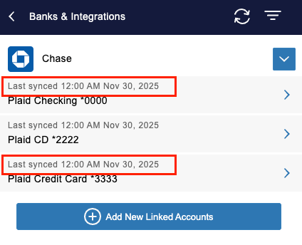 You can view the last synced date and time for each linked account on the Banks & Integrations screen.