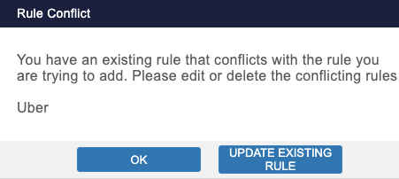 - If you are creating a rule similar to an active rule, then a prompt will ask you to edit the rule so it matches the already active rule or ‘Update the Existing Rule’