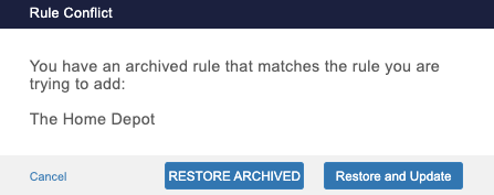 - If this rule matches a rule that is archived, then a prompt will show either asking you to ‘Restore Archived’ or Restore and Update’ so that you do not have duplicate rules